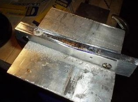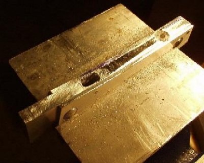 Вы можете также вырезать спусковую скобу как часть центральной секции, как на рисунке, но я не смог приобрести достаточно большого алю-миниевого бруска для этого, поэтому я сделал спусковую скобу отдельной деталью. Внешние размеры не являются ужасно критическими, так как после вырезания боковых пластин и центральной секции они могут быть подогнаны до нужного размера вместе, чтобы сделать заключительную подгонку правильной.