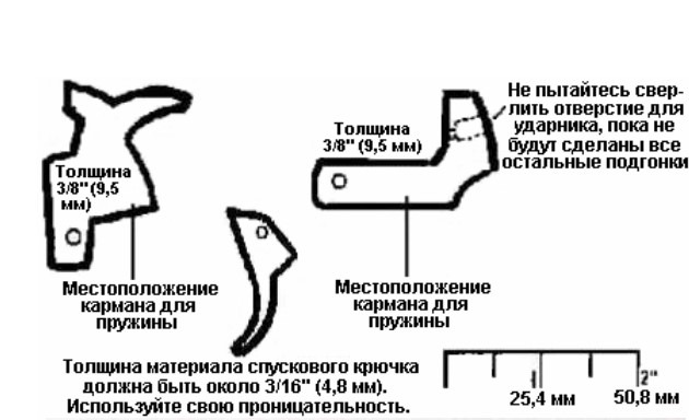 Теперь давайте посмотрим на спусковой крючок. Стальная заготовка, ис-пользуемая для спускового крючка, должна иметь толщину примерно в половину толщины затвора и курка. При вырезанииосновного очертания удостоверьтесь, что Вы оставляете достаточно материала наверху, это – поверхность зацепления для шептала. При подгонке мы захотим убедить-ся, что мы имеем уверенное зацепление, которое будет надёжно держать курок. Используйте большой круглый напильник на внутренней части передней стороны спускового крючка, с которой будет соприкасаться Ваш палец, Вы можете проявить здесь своё творчество и сделать широкий гладкий спусковой крючок или с насечками, если Вам нравится. Я нашёл простой способ делать зазубренности с помощью дешевых напильников для чистки резьбы, доступных в большинстве скобяных лавок, они долж-ны иметь восемь отдельных сторон для очистки резьбы с различным ша-гом, используйте это, чтобы начать делать зазубренности, и завершите их маленьким треугольным напильником. Я предпочитаю гладкий спусковой крючок и доволен результатами и своими ощущениями.