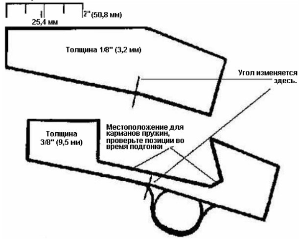 В этот момент у Вас должны быть установлены все движущиеся детали и двигаться свободно. Теперь Вы можете подготовить детали к установке пружин, просверлив карманы в местах, обозначенных на шаблонах. Сверлите только достаточно глубоко для надёжной установки пружины, менее 1/8 дюйма (3,2 мм) должно быть достаточно. Торцевая фреза сделает пло-ским дно отверстия, что будет лучше, чем конусное дно отверстия от стандартного сверла. Вам надо измерить диаметр пружин, чтобы Вы мог-ли выбрать размер карманов для них, но они должны быть немного мень-ше 3/8 дюйма (9,5 мм), так как это –размер центральной секции. При вы-боре пружин для затвора, курка и спускового крючка Вам придётся при-бегнуть к методу проб и ошибок. Вы можете видеть, что пружины долж-ны иметь диаметр меньший толщиныдеталей, и Вы можете видеть, какой длины они будут в состоянии покоя, и измерить, каковау них длина при сжатии. Пружина для затвора не должна быть очень сильной, поскольку она должна только закрывать затвор. Пружина для курка должна быть несколько более сильной, поскольку он должен будет ударить ударник с достаточной энергией, чтобы патрон выстрелил. Возвратная пружина спускового крючка будет похожа на пружину от шариковой ручки, но только длиной около 3/8 дюйма (9,5 мм). Основываясь на этой небольшой информации, купите несколько пружин, которые соответствуют размерным требованиям, и, возможно, возьмите по две штуки каждой, так как Вам придётся резать их приподгонке. Вы должны будете эксперименти-ровать с длиной и силой каждой пружины, чтобы заставить их делать ра-боту, требующуюся от них.