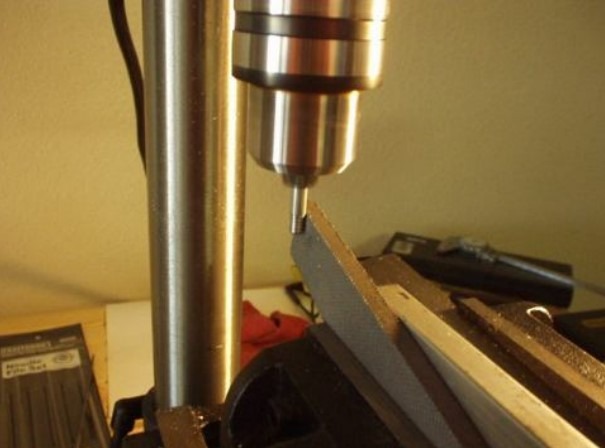 местонахождение позиции для отверстия точно так же, как описано, но сделайте некоторые расчёты прежде, чем будете сверлить. Вы можете вычислить толщину стенок стволов, измерив полный диаметр, разделивего на 2 и отняв0,224 дюйма (5,69 мм), это последняя цифра может изме-ниться, но не больше чем на несколько тысячных дюйма. Это даст Вам толщину материала, который Вы сверлите, и будьте очень осторожны, чтобы не разрушать Ваш ствол, просверлив стенку насквозь. Если нет 0,2 дюйма (5,1 мм) стенки, чтобы сверлить вовнутрь, Вы должны заканчивать отверстие сверлом для обработки дна (с плоским концом) и чистовым метчиком, они оставят плоское дно отверстия в противоположность V-образному дну, которое не удовлетворяет Вашей цели, но обычные сверла и метчики формируют именно это.