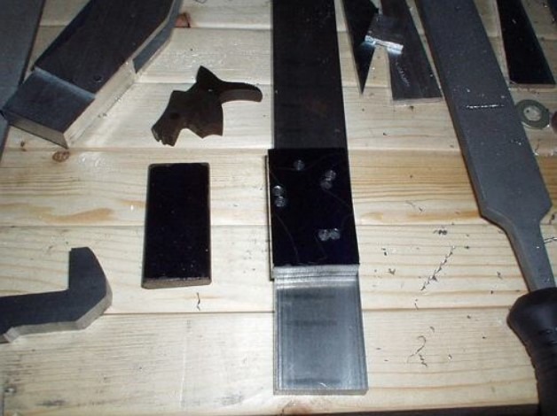 Смотрите на фотографии, как полка ниже лицевой частикурка поддержи-вает затвор, когда он закрыт. Это было снято во время подгонки деталей; свёрла были по размеру шарнирных отверстий и использовались только для подгонки. Вы видите центральную секцию и противоположную боко-вую пластину в положении съёмки, труба –вместо ствола в целях макетирования. Имеются шаблоны для затвора, курка и спускового крючка, которые должны быть напечатаны, затем перенесены на картон или что-то достаточно толстое, чтобы держать свою форму, потом, нако-нец, перенесены на Ваши стальные листы с помощью покрытия ста-ли краской «Dykem»[2] или подобным продуктом.Также имеется раз-мерный масштаб деталей, который Вы должны проверять, печатая шабло-ны. Возможно, Вам придётся изменить размеры Вашей распечатки, чтобы получить шаблоны надлежащих размеров.